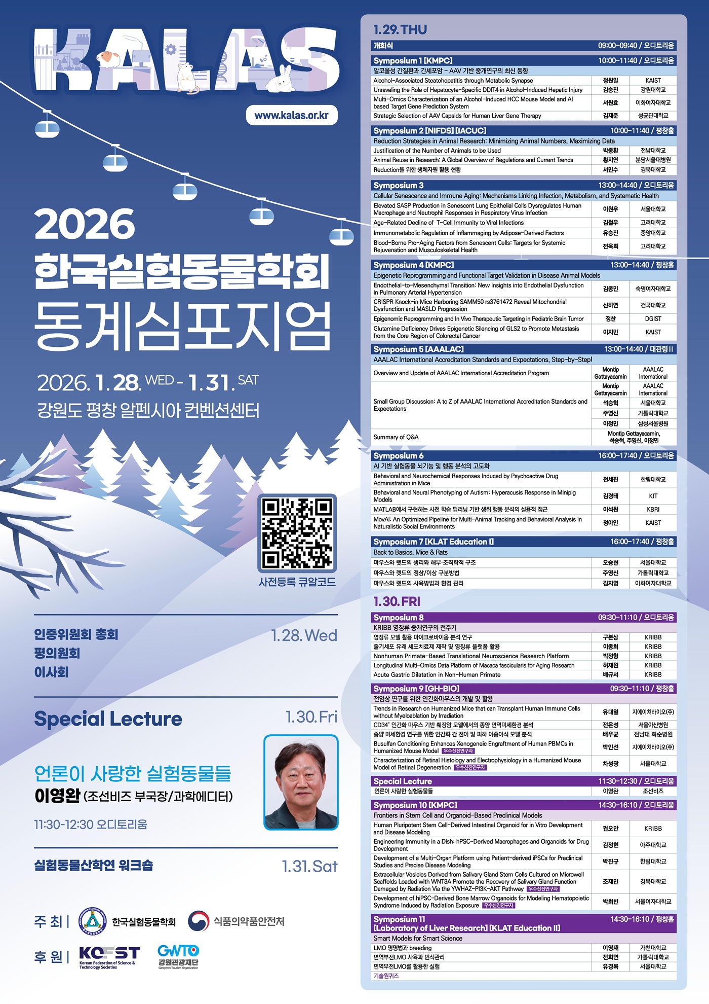 한국실험동물학회(KALAS, 이사장 남기택)의 2026년 동계심포지엄이 1월 28일(수)부터 1월 31일(토)까지 강원도 평창 알펜시아 컨벤션센터에서 개최된다.