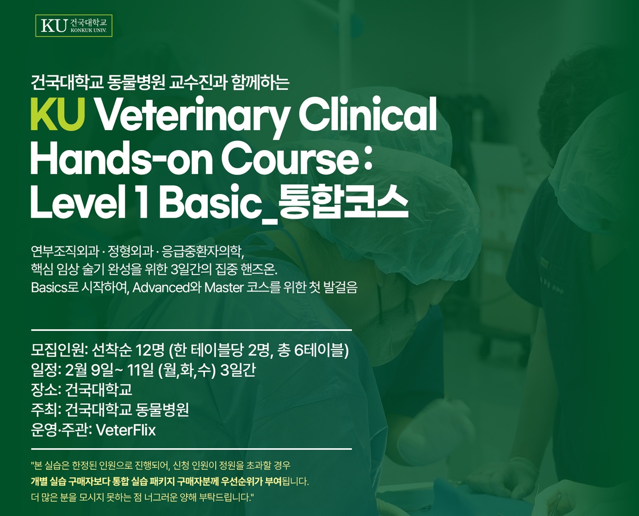 건국대학교동물병원이 주최하고 베터플릭스가 주관하는 ‘KU 수의 임상 핸즈온 코스(KU Veterinary Clinical Hands-on Course): Level 1 Basic’이 2월 9일부터 11일까지 3일간 건국대학교에서 개최된다.