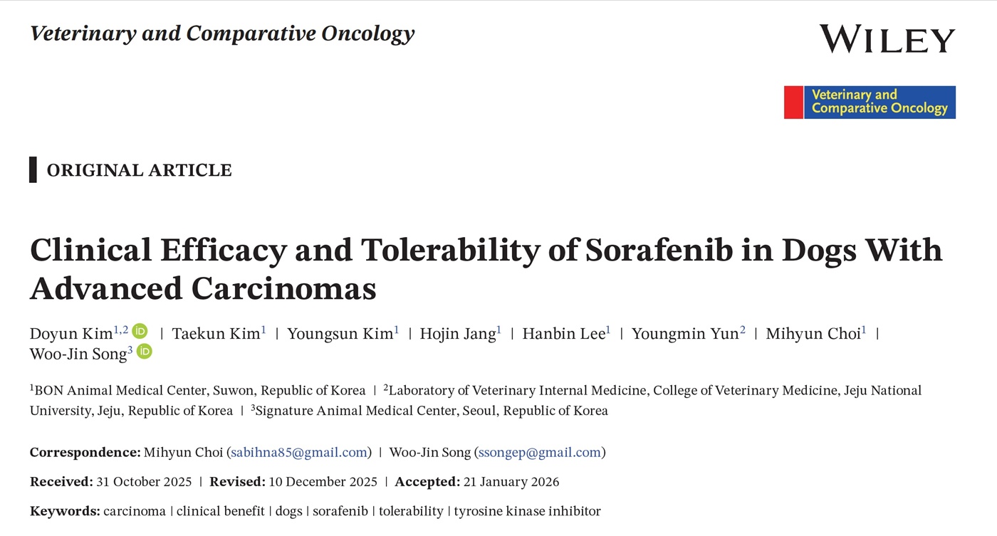 수원 본동물의료센터 종양팀(김도윤·최미현·김용선 박사)이 개의 진행성 암종을 대상으로 한 표적항암제 ‘소라페닙(Sorafenib)’의 전향적 임상 연구 결과를 국제 수의종양학 저널 ‘Veterinary and Comparative Oncology(VCO)’에 게재했다(Clinical Efficacy and Tolerability of Sorafenib in Dogs With Advanced Carcinomas).