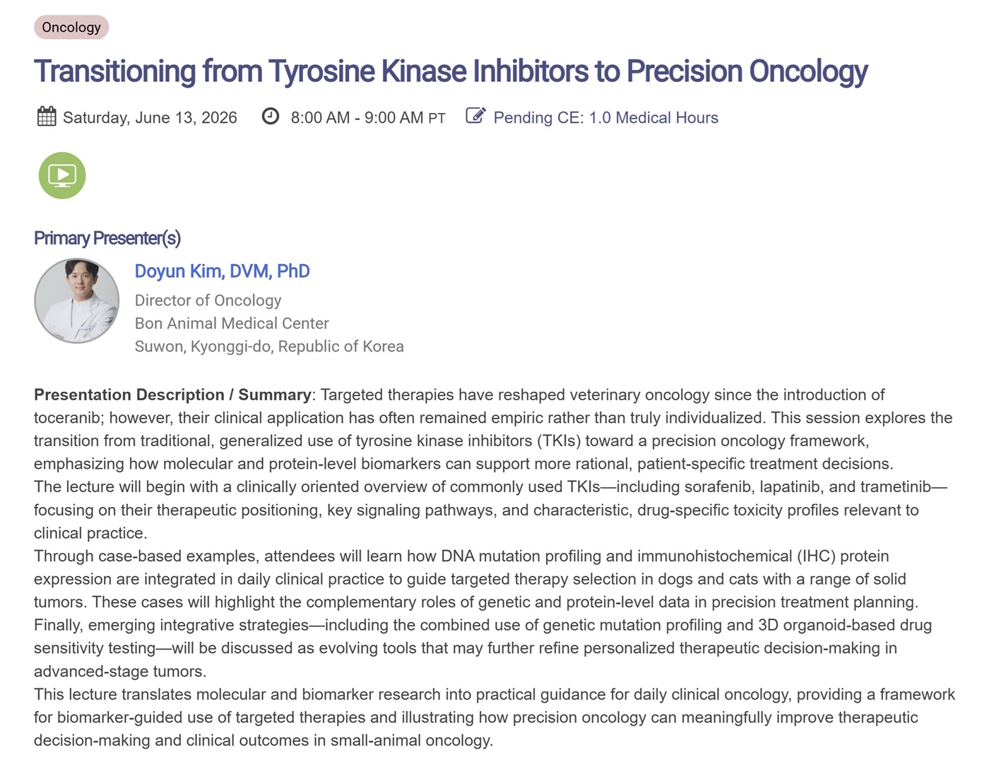2026년 미국수의내과학회(ACVIM Forum 2026) 김도윤 박사 강의 소개 페이지