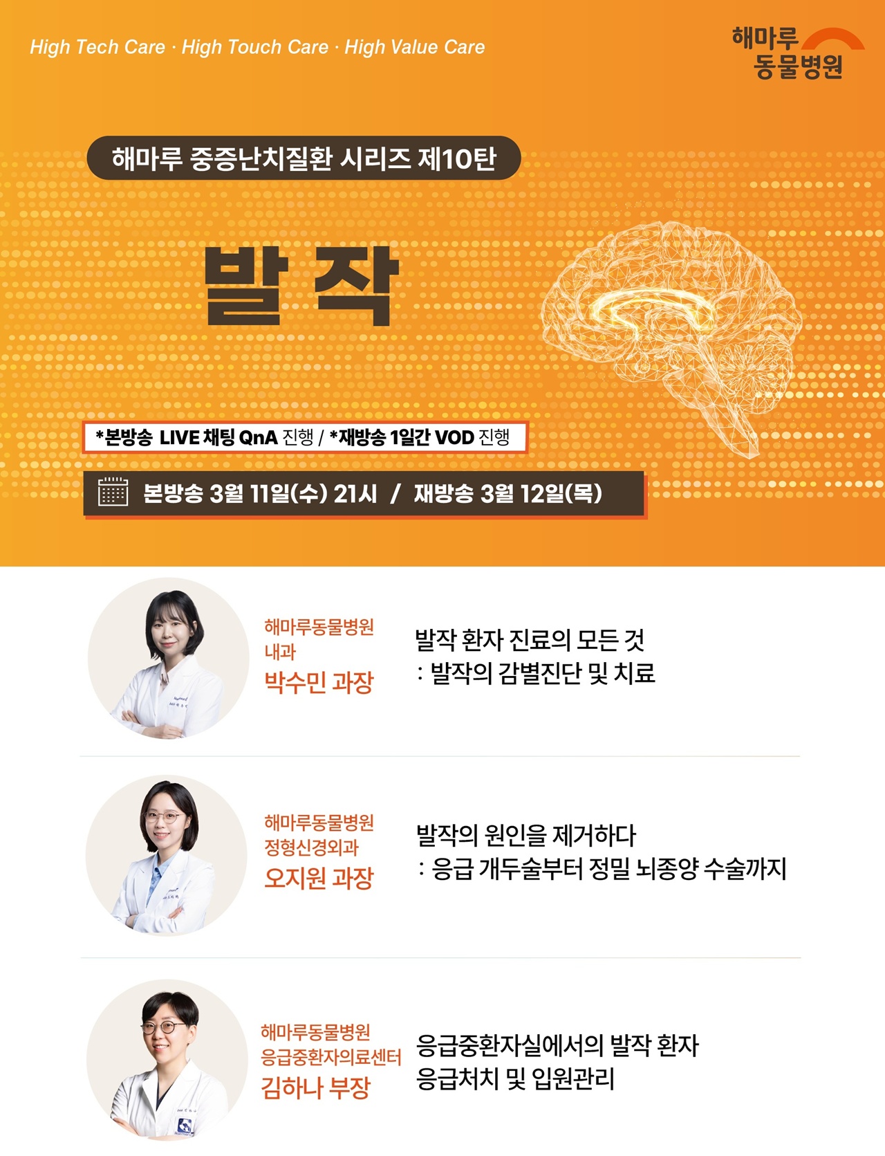 분과별 전문진료 체계와 긴밀한 협진 시스템을 갖춘 해마루동물병원이 중증난치질환 웨비나 시리즈 10회를 맞아 ‘발작’을 주제로 한 특별 세미나를 진행한다.