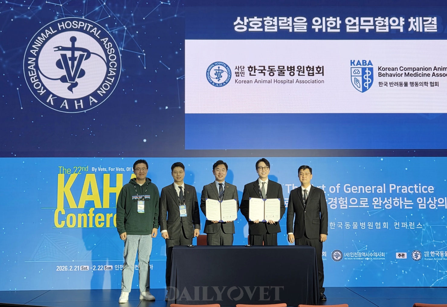 (사)한국동물병원협회(KAHA, 회장 최이돈)와 한국반려동물행동의학협회(KABA, 회장 나응식)가 동물의료 발전 및 병원 운영 역량 강화를 도모하기 위해 업무협약(MOU)을 체결했다.