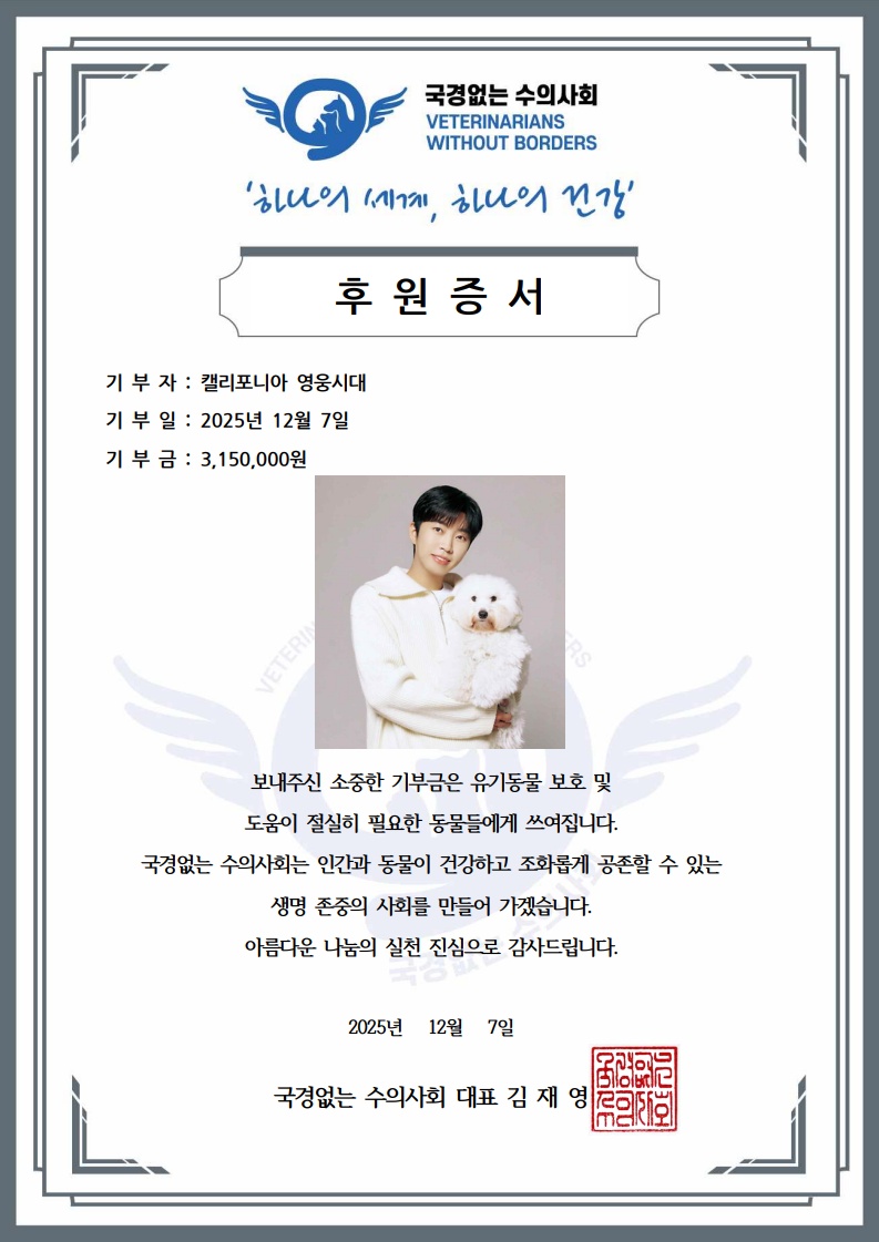 국경없는 수의사회 김재영 대표는 “팬클럽 여러분의 따뜻한 나눔은 동물을 넘어 사람과 지역사회의 안전까지 지키는 큰 힘이 된다”며 “보내주신 315만 원은 의료 사각지대의 생명들을 위해 투명하고 소중하게 사용하겠다”고 감사의 뜻을 밝혔다.