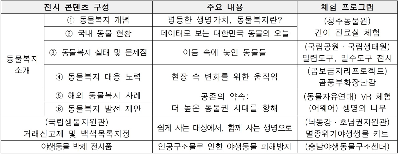 동물복지 개념, 국내 동물 현황, 동물복지 실태 및 문제점, 국내 동물복지 대응 노력, 해외 동물복지 사례, 국내 동물복지 발전 제안까지 총 6개 소주제로 구성됐다. 각 기관·시민단체가 관련 체험프로그램을 운영한다.