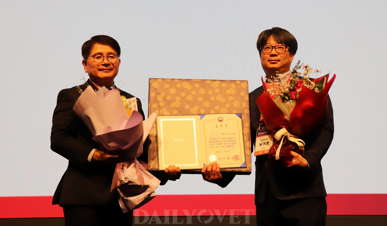 지난해 의성-안동을 중심으로 경북 지역을 휩쓸었던 대형 산불 피해 당시 대피령이 내려진 가운데서도 피해 농장에 진입해 가축 재난대응에 나선 공로를 인정받았다. 안동시수의사회 남기준 부회장이 대표로 수상했다.