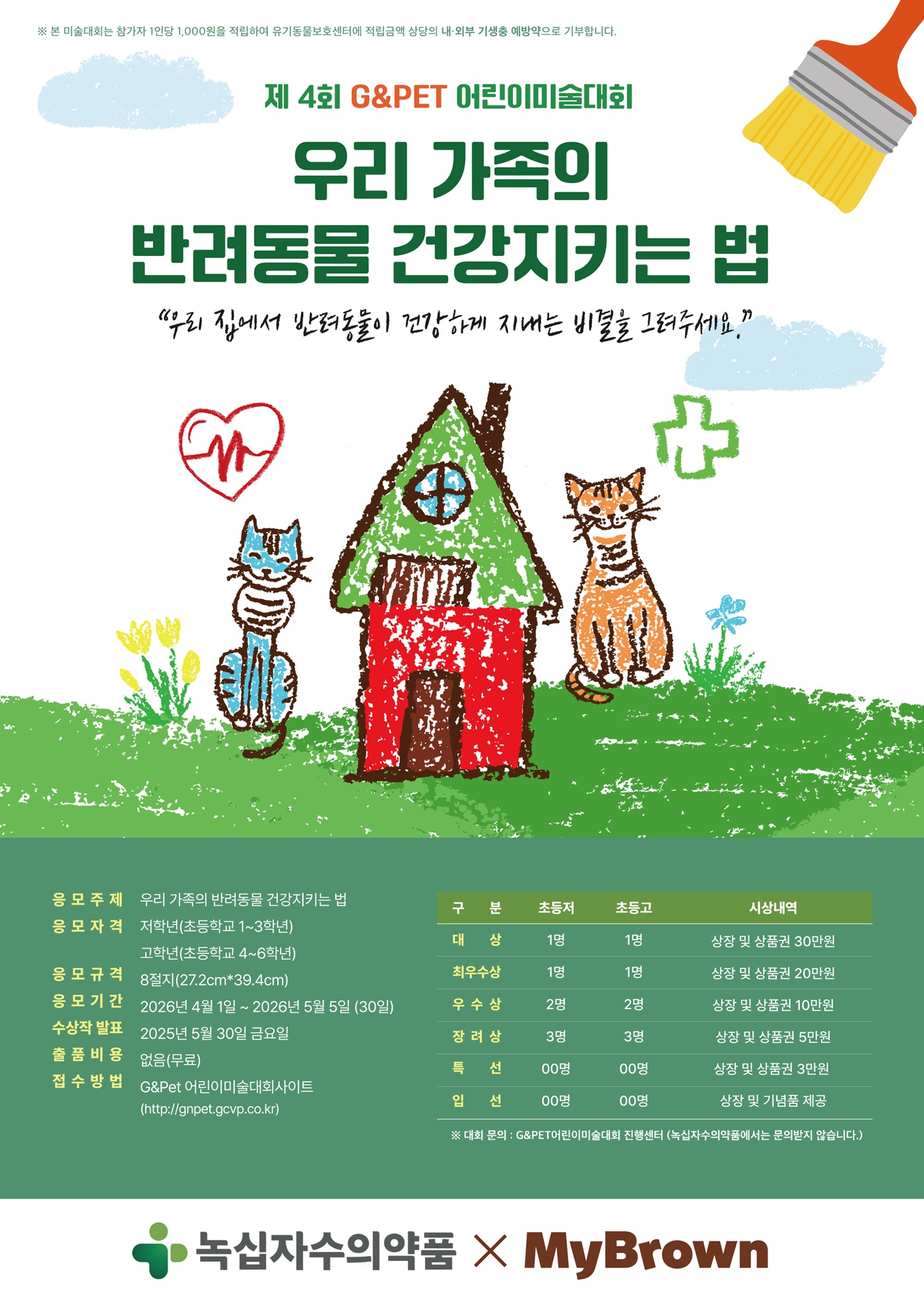 이번 제4회 G&Pet 어린이 미술대회는 녹십자수의약품과 반려동물전문보험사 마이브라운(MyBrown) 펫보험이 공동으로 진행한다.