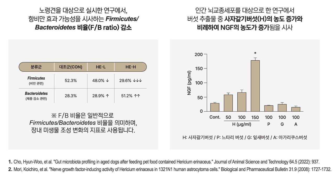 노령 반려동물에서 가장 난제로 꼽히는 증상이 인지기능장애증후군(CDS, Cognitive Dysfunction Syndrome)이다. 알루액티브의 핵심 성분인 사자갈기버섯 추출물(Hericium erinaceus)은 헤리세논(Hericenones)과 에리나신(Erinacines) 성분을 함유하고 있다. 이들이 BBB를 통과해 뇌 조직에 직접 도달한다는 점이 타 버섯 추출물과 차별화되는 지점이다.
