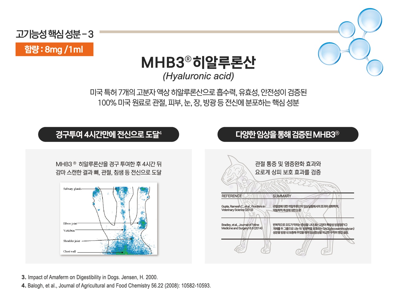 히알루론산은 관절강 내 점탄성 유지, 연골 보호, 염증 억제 기능뿐 아니라 요로 점막의 글리코사미노글리칸층(GAG layer) 복원에도 기여하여, 노령묘에 흔히 나타나는 하부요로계질환(FLUTD) 관리에도 유용하다.