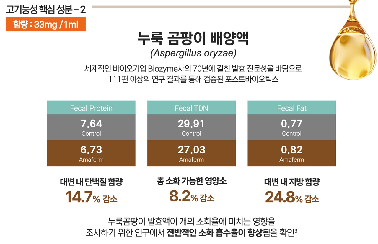 Jensen(2000)의 개 대상 임상 연구에서 누룩곰팡이 배양액이 단백질과 지방을 포함한 총 소화가능영양소(TDN) 흡수율을 유의하게 향상시켰다. 특히, 대변으로 배출되는 단백질 함량이 감소해, 실질적인 영양 이용률이 개선되는 효과가 확인됐다.