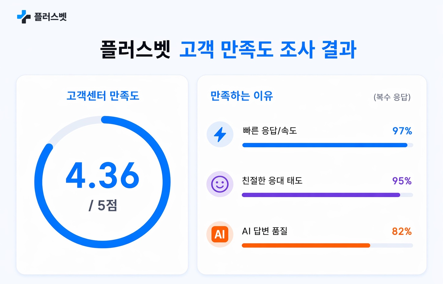 동물병원 전자차트 플러스벳이 2026년 1분기 고객만족도(NPS) 조사에서 상담센터 만족도 4.36점(5점 만점)을 받았다고 밝혔다. 사용자들은 상담 만족 요인으로 ‘빠른 응답 속도’, ‘친절한 응대’, ‘전문성’을 꼽았다.