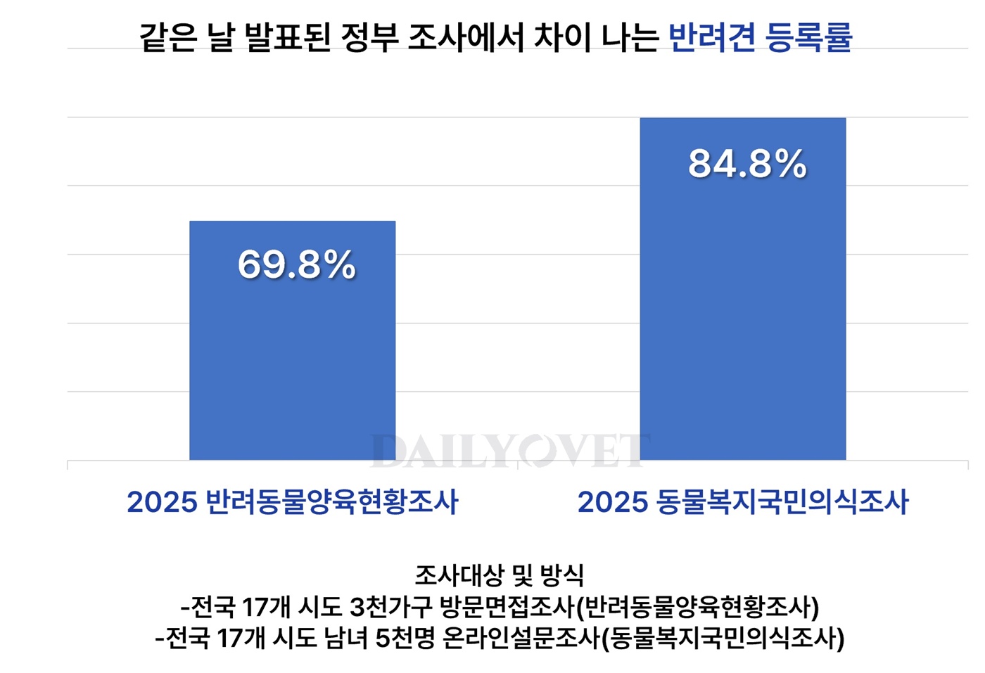 참고로, 2025년 반려동물 양육현황조사는 지난해 10월 31일부터 12월 12일까지 전문 조사원이 전국 17개 시·도의 3,000가구를 직접 방문해 면접조사하는 방식으로 실시됐고(95% 신뢰수준에서 표본오차 ±1.79%P), 2025년 동물복지 국민의식조사는 9월 11일부터 9월 26일까지 전국 17개 시·도 5,000명을 대상으로 온라인 설문조사로 진행됐다(95% 신뢰수준에서 표본오차 ±1.39%P).
