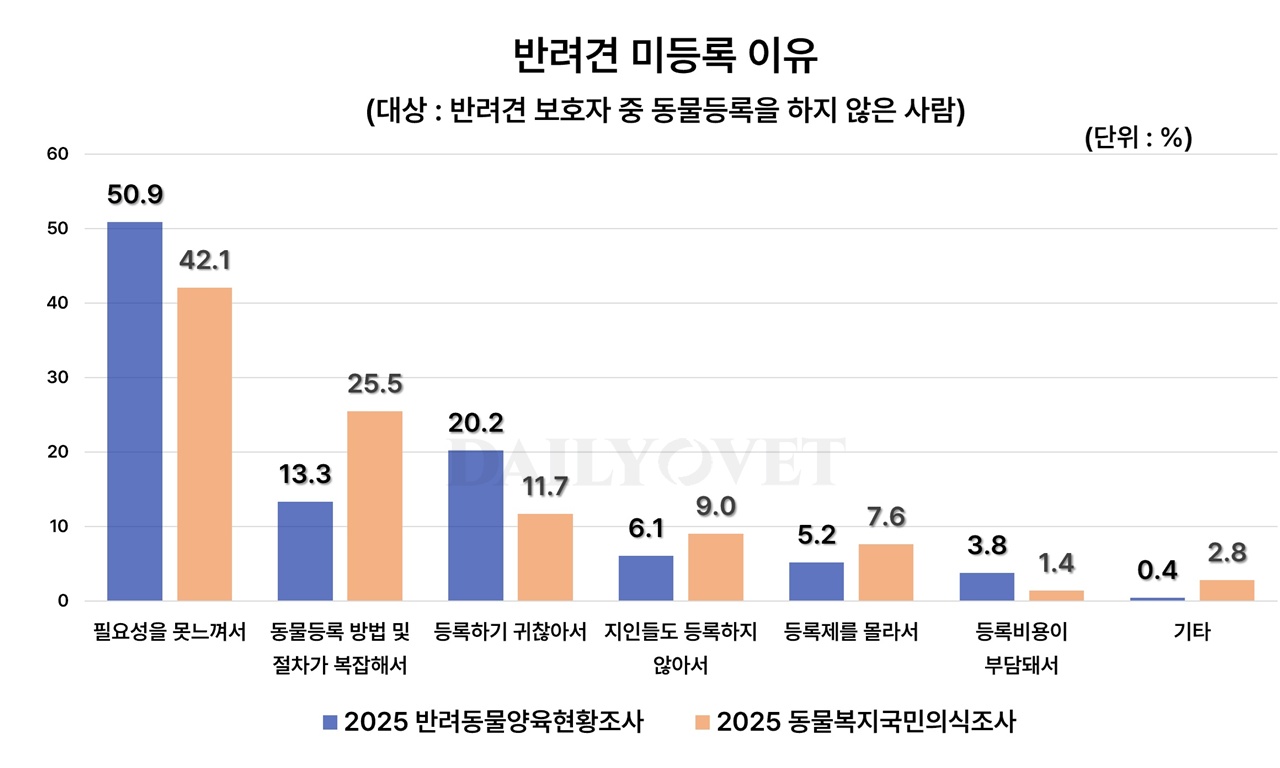 2025년 반려동물양육현황조사에서는 “등록하기 귀찮아서(20.2%)”가 2위, “동물등록 방법 및 절차가 복잡해서(13.3%)”가 3위, “지인들도 등록하지 않아서(6.1%)”가 4위, “동물등록제도를 알지 못하여서(5.2%)”가 5위를 차지했다.