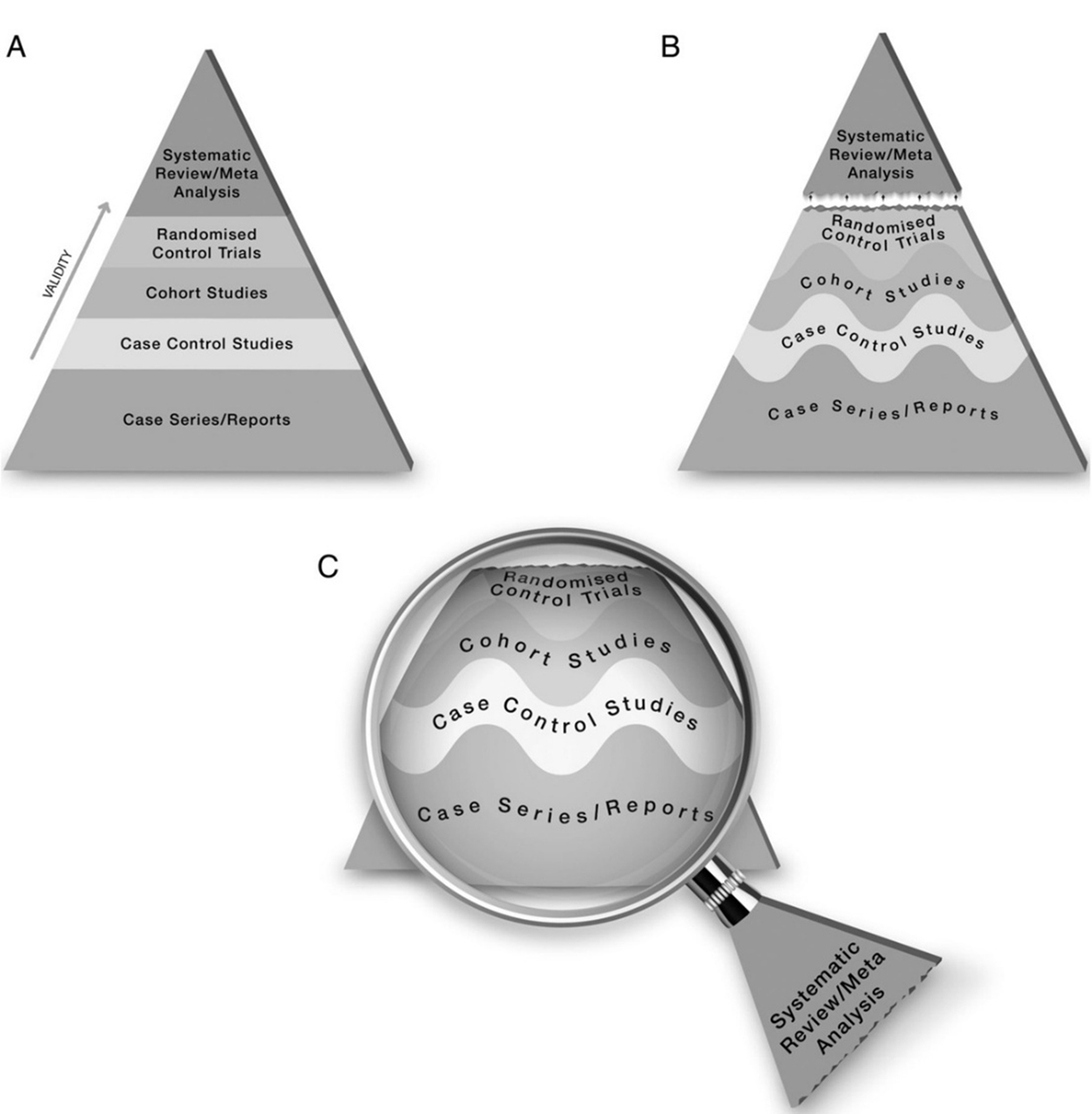 아마 많이들 들어보셨을 ‘증거 피라미드’도 생각해볼 수 있습니다(그림1). 맨 아래는 증례(case report), 그 위는 코호트(cohort), 그 위는 무작위 대조시험(RCT), 가장 위에는 메타분석(meta-analysis)이 위치하죠. 이 그림을 보면 “위로 올라갈수록 증거 수준이 높다”고 생각하기 쉽습니다.