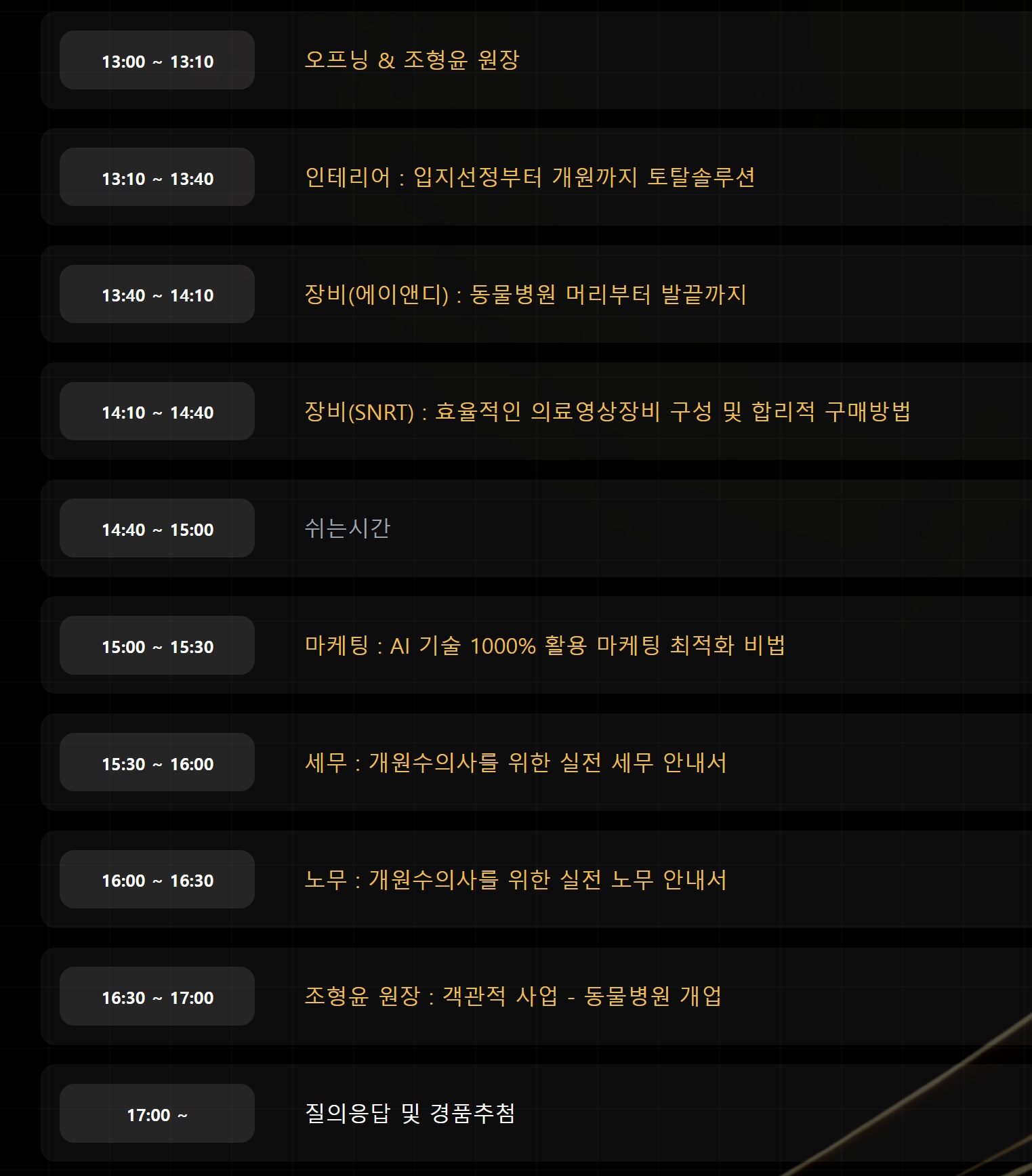 과천우주동물병원 조형윤 원장이 동물병원 개업에 관해 소개하고, 더원아이앤디, 에이앤디, SNRT, 네온마케팅, 택스스퀘어가 각각 동물병원 인테리어, 동물병원 의료장비, 동물병원 마케팅, 동물병원 세무·노무 전문 강의를 진행한다.