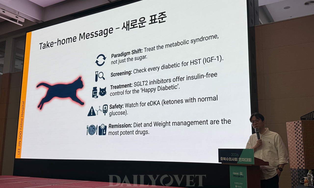 이진수고양이병원 이진수 원장은 4월 26일(일) 청주 엔포드호텔에서 열린 2026 충북수의사회 연차대회에서 고양이 당뇨 관리 방법을 업데이트했다. 2025년 iCatCare 가이드라인(이하 가이드라인)과 최신 임상 전략을 상세히 짚었다.