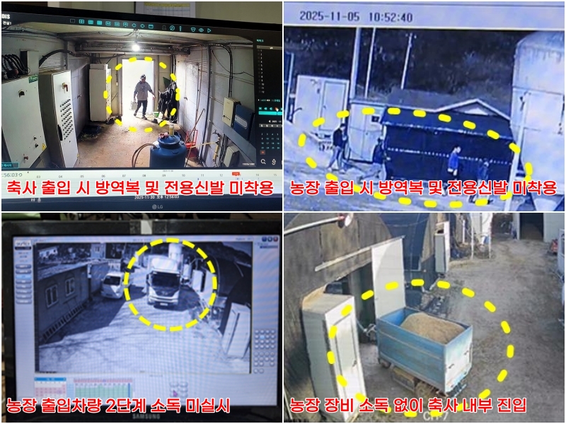 농장 출입자 소독 미실시 및 농장 전용 의복과 신발 미착용은 7개 농장 모두에서 공통적으로 확인됐다. 축사 출입자에 대한 소독·환복 미비나 축산차량 농장 내 진입금지 위반 등도 4개 농장에서 확인됐다.