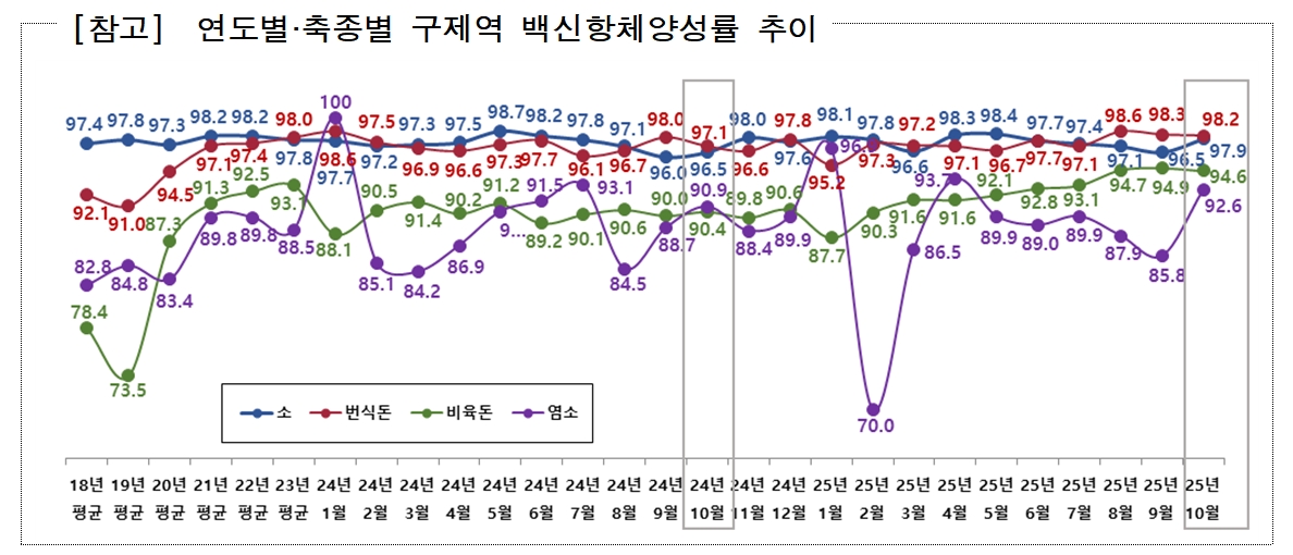 2025년 영암 구제역도 마찬가지다. 전년도(2024년) 항체양성률은 92.3%였지만, 1차 발생농장 비육동의 항체양성률은 12.5%에 그쳤다.