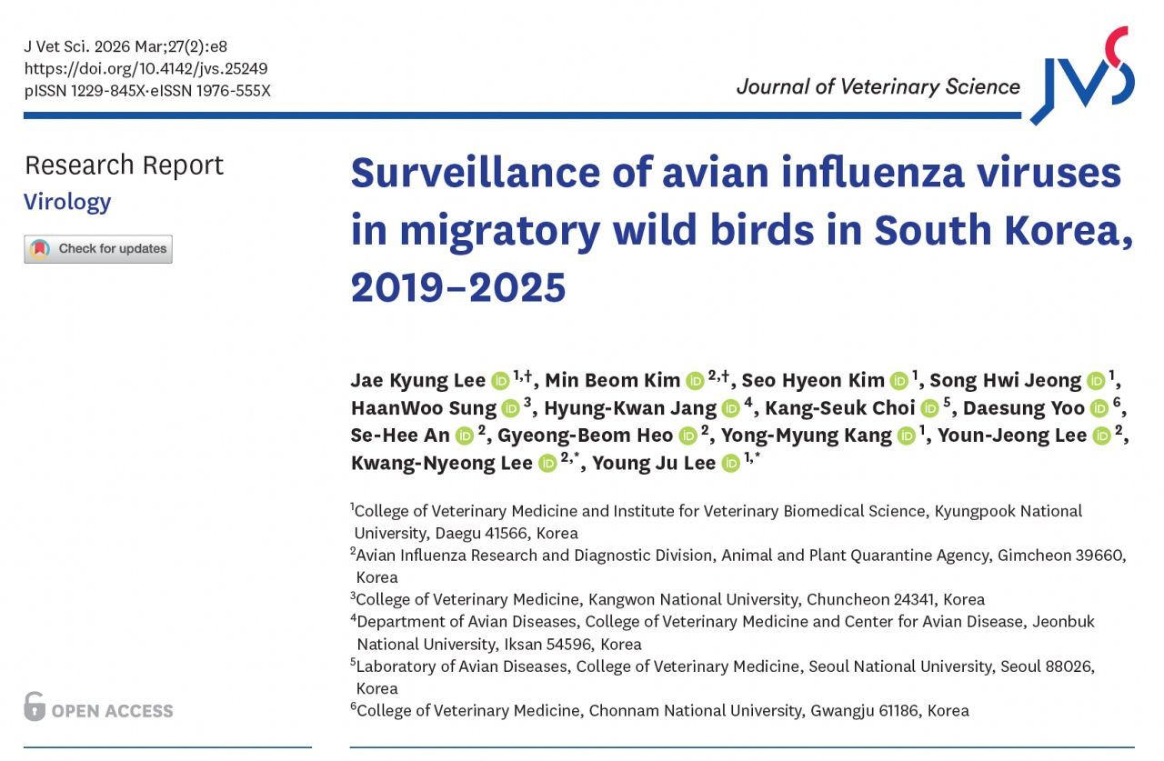 이번 분석 결과는 대한수의학회가 발행하는 국제학술지 Journal of Veterinary Science(JVS)에 1월 게재됐다(Surveillance of avian influenza viruses in migratory wild birds in South Korea, 2019–2025).