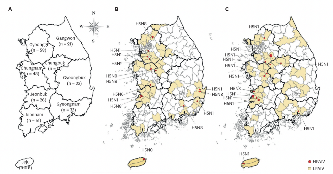(A. 시도별 철새도래지 분포 B. 철새도래지의 AI 검출 C. 가금농장 인근의 AI 검출)