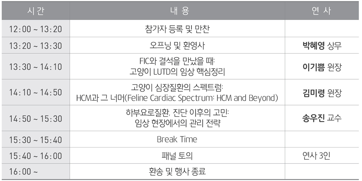 연사 : 송우진 제주대 수의대 교수, 이기쁨 고려동물메디컬센터 고양이병원 원장, 김미령 이승진동물의료센터 마이캣클리닉 원장