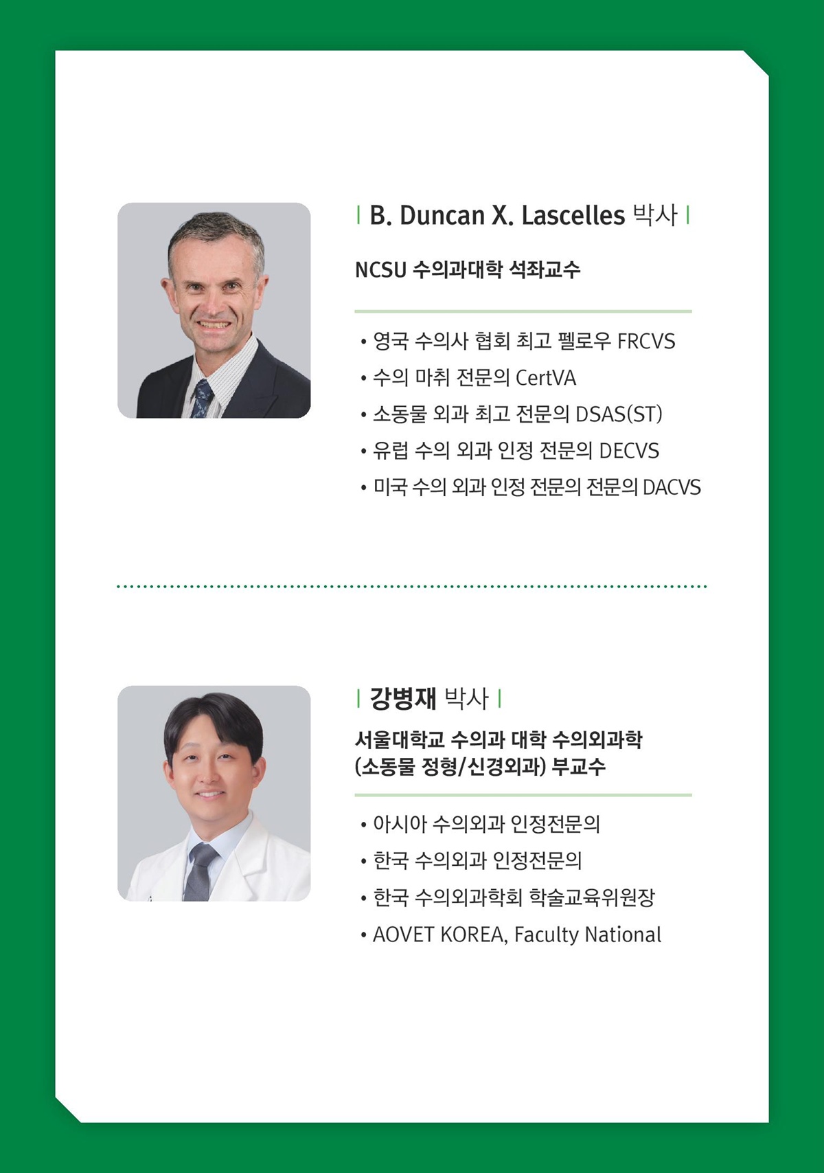 강사 : Duncan X. Lascelles 박사(노스캐롤라이나주립대학교 석좌교수, 미국수의외과전문의), 강병재 서울대학교 수의과대학 교수