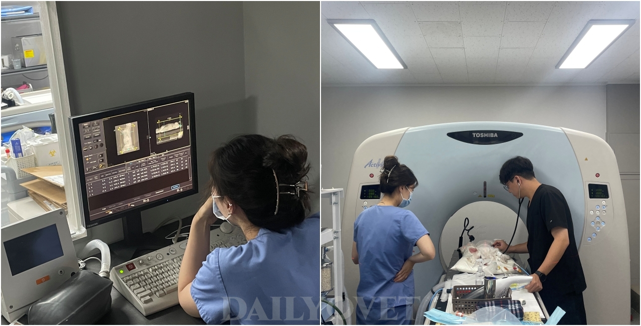 오후 3시 반, 말티즈 ‘몽이(가명)’의 simulation CT 촬영이 진행됐다. 비뇨기 종양으로 인해서 수신증 및 배뇨 곤란 증세를 보여 방사선 치료를 고려 중인 환자다. 방사선 치료에 앞서 simulation CT 촬영은 필수적이다.