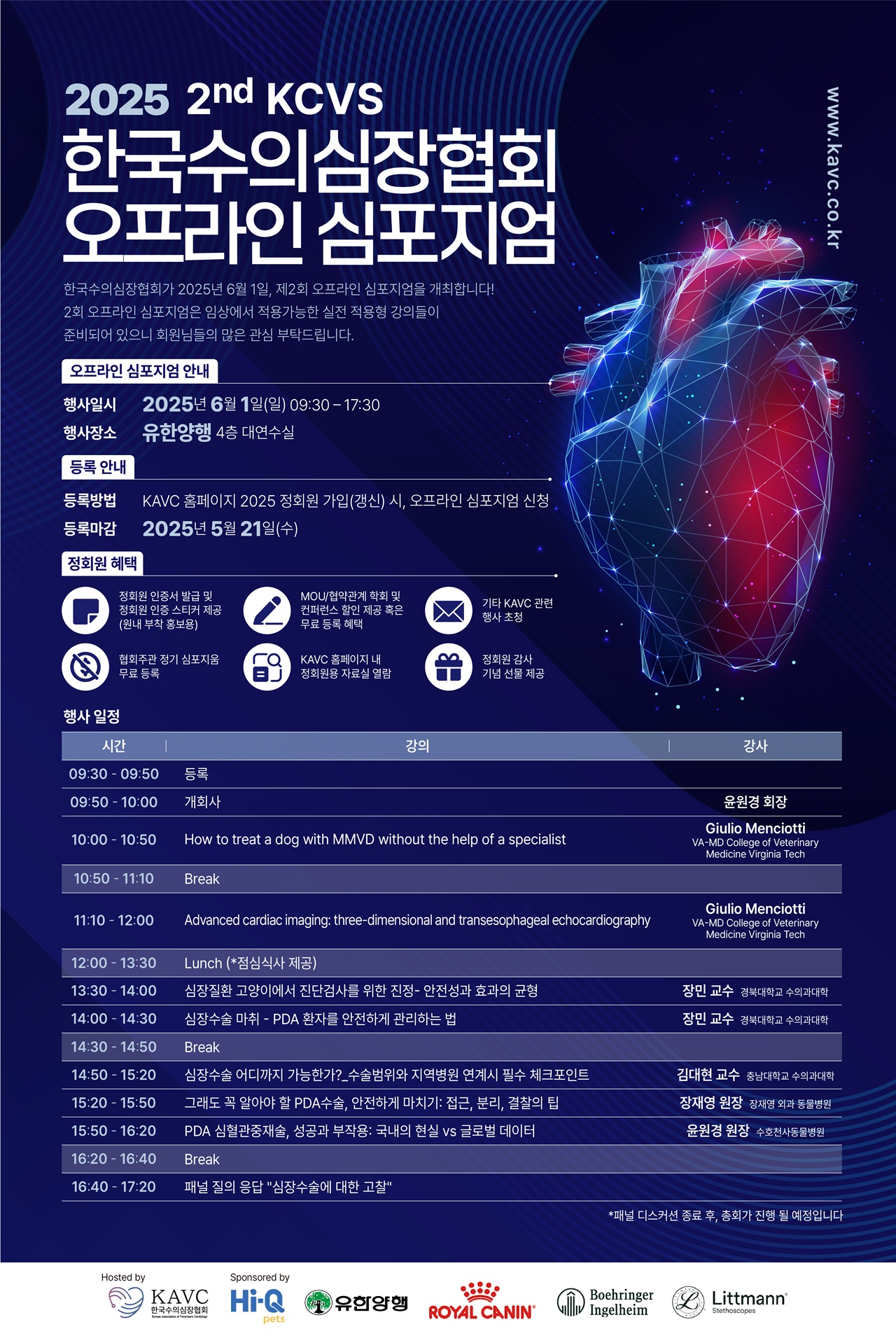 모든 강의 후에는 ‘심장수술에 대한 고찰’을 주제로 패널 질의응답이 진행되며, 패널 디스커션 종료 이후 한국수의심장협회 총회가 이어진다.