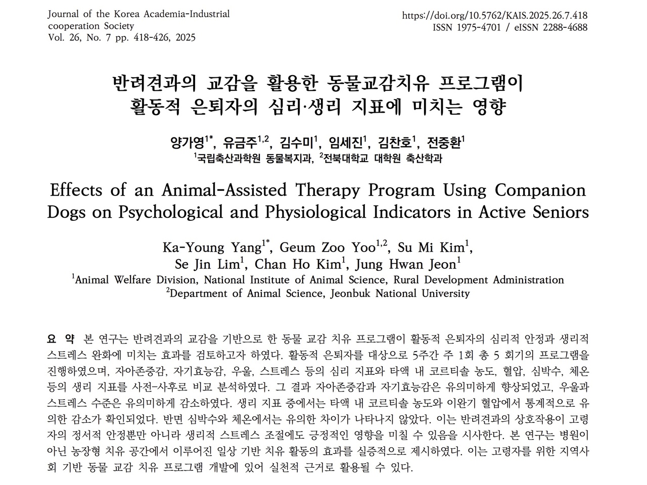 반면, 우울 척도(11.3→6.7점)와 스트레스(2.90→2.60점) 수준은 유의하게 감소했다. 생리적 지표에서도 스트레스 호르몬인 코르티솔 농도가 38.8% 감소하고 이완기 혈압은 7.3% 낮아졌다. 축산과학원은 “이는 의학적으로도 의미 있는 수준의 개선으로 평가된다”고 설명했다.