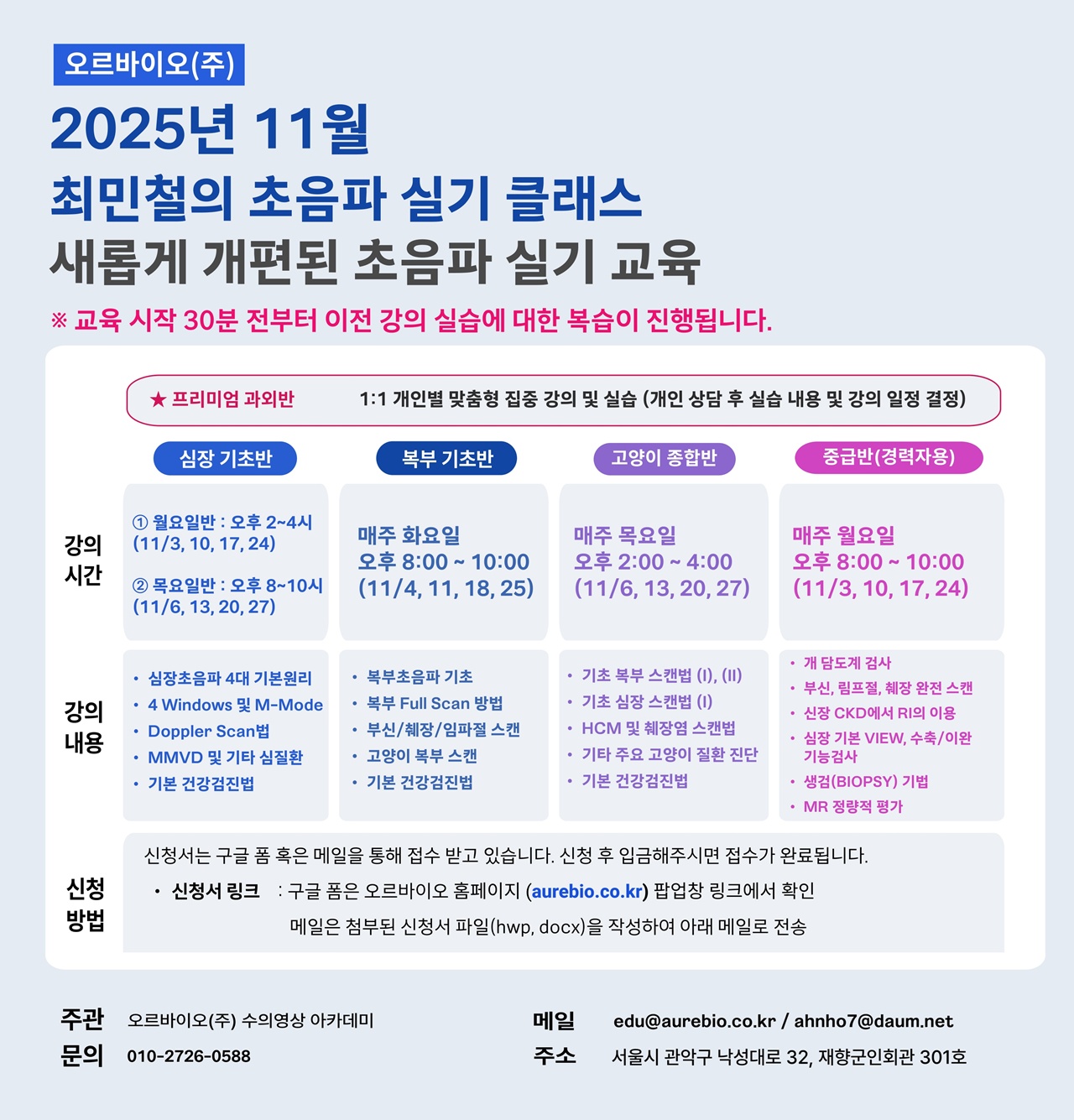 오르바이오의 2025년 11월 초음파 실기교육은 심장초음파(기초반), 복부초음파(기초반), 고양이종합반, 개 중급반(경력자용)으로 구성됐다.