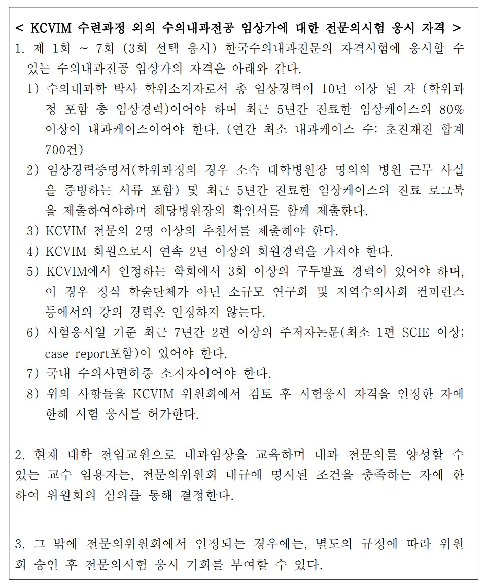 수련과정을 거치지 않고 시험을 치르기 위해서는 수의내과학 박사 학위소지자로서 학위과정을 포함한 10년 이상의 임상 경력, 연간 최소 700건 이상의 내과 케이스 진료, KCVIM 인정 학회에서 3회 이상 구두발표, 최근 7년간 2편 이상 주저자 논문 게재(최소 1편 SCIE 논문) 등의 요건을 만족해야 한다.