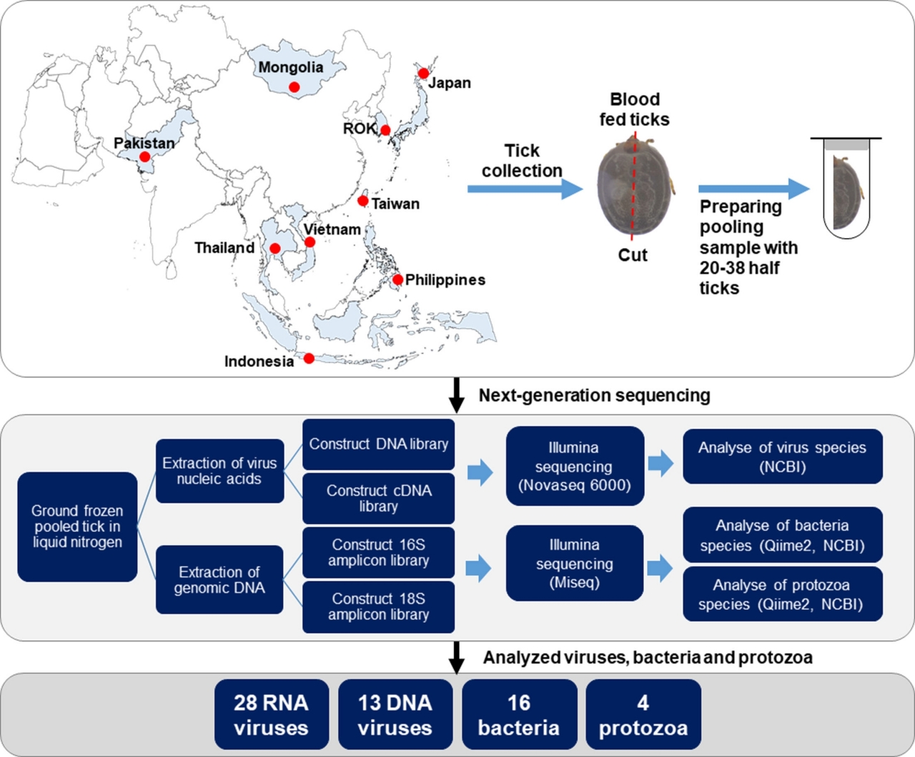 연구진은 한국, 일본, 베트남, 태국, 인도네시아, 필리핀, 대만, 몽골, 파키스탄에 걸쳐 농장동물, 야생동물, 철새, 동물원 파충류 등 다양한 동물을 흡혈한 참진드기 261마리를 대상으로 차세대 염기서열 분석(NGS)을 적용해 병원체를 탐색했다.