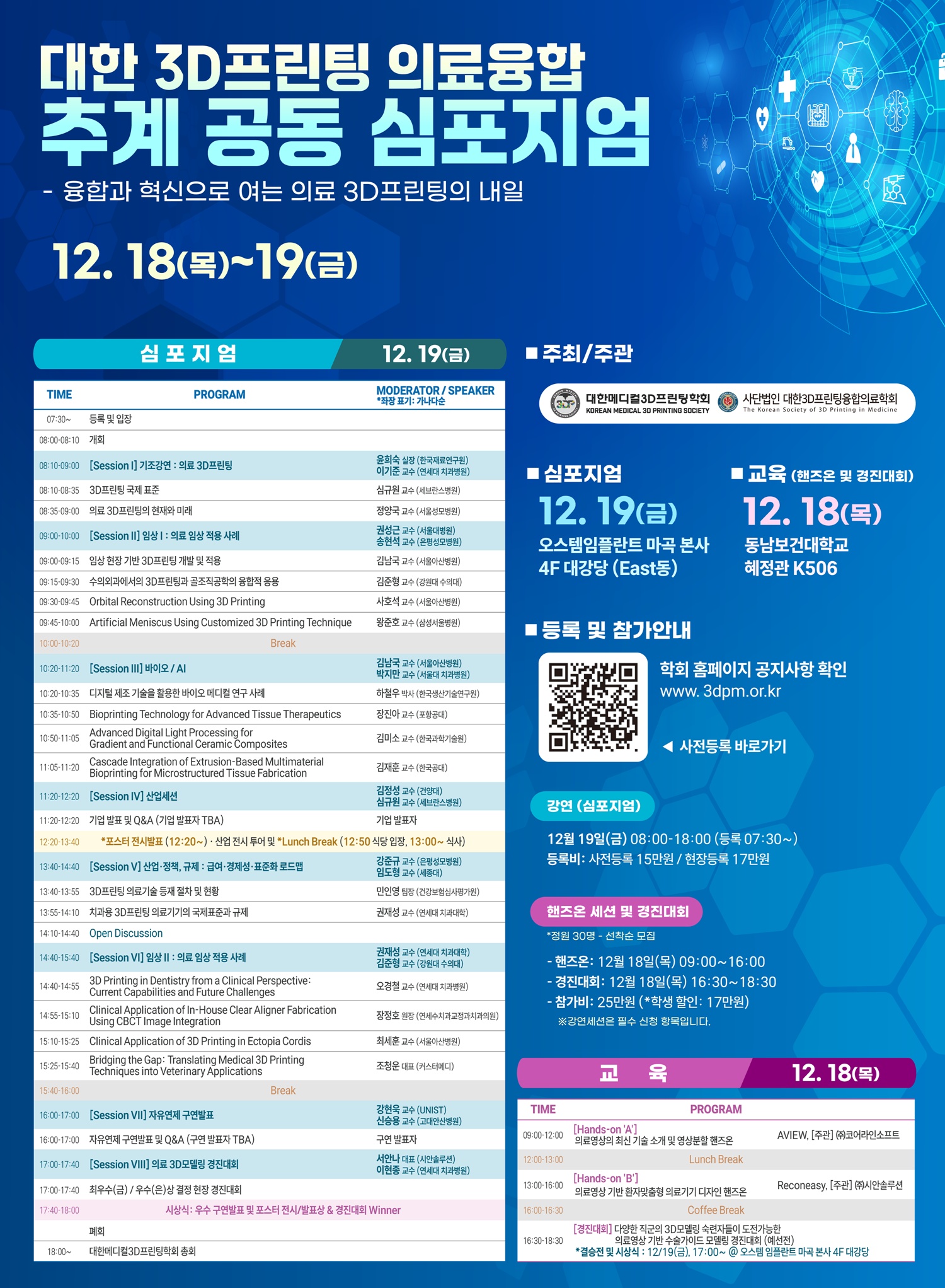 대한메디컬3D프린팅학회와 대한3D프린팅융합의료학회가 공동 주최·주관하는 이번 심포지엄은 ‘융합과 혁신으로 여는 의료 3D 프린팅의 내일’을 주제로 12월 18일~19일(목~금) 이틀간 진행된다. 18일(목)에는 동남보건대에서 핸즈온 및 경진대회가 열리고, 19일(금)에는 오스템임플란트 마곡에서 심포지엄이 이어진다.