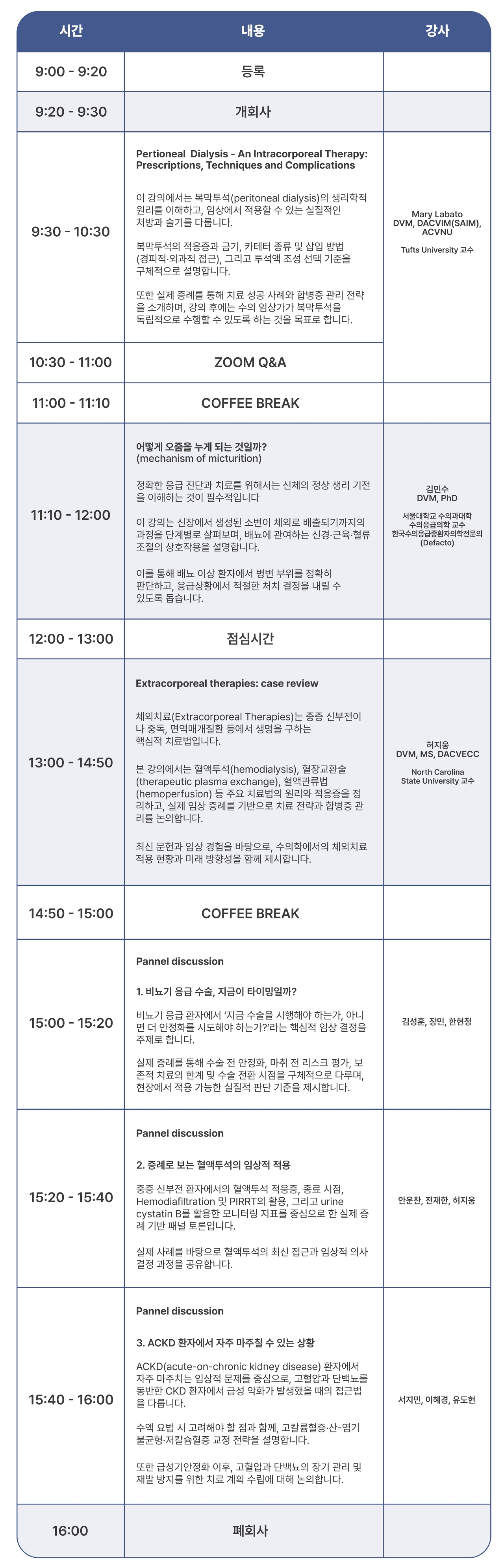 미국수의내과전문의인 매리 라바토 터프츠 대학 교수가 복막 투석을, 김민수 서울대 교수가 비뇨기계 생리 및 관련 응급 대응을, 미국수의응급중환자과전문의인 허지웅 노스캐롤라이나 주립대 교수가 혈액투석·혈장교환술·혈액관류 등 체외치료(extracorporeal therapies)를 주제로 강연에 나선다.