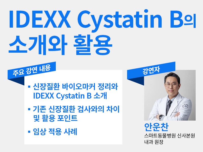 강의는 스마트동물병원 신사본원 안운찬 내과원장이 맡았다. 안 원장은 풍부한 임상 경험과 연구 결과를 바탕으로 Cystatin B 기반의 AKI 진단 및 임상 적용 사례에 대해 깊이 있는 내용을 전달할 예정이다.