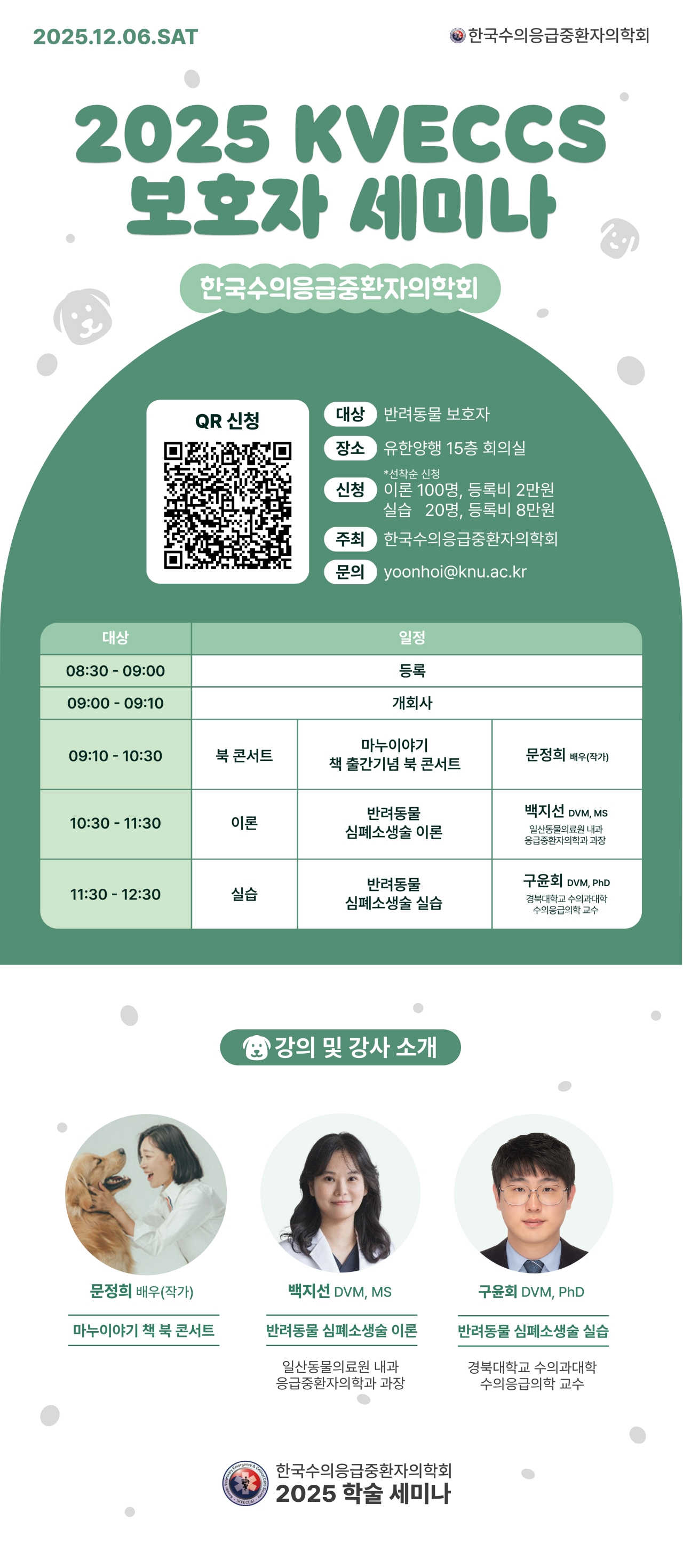 한국수의응급중환자의학회(KVECCS)가 오는 12월 6일(토) 서울 유한양행 본사에서 반려동물 보호자를 대상으로 실습 중심의 심폐소생술(CPR) 교육 세미나를 진행한다.