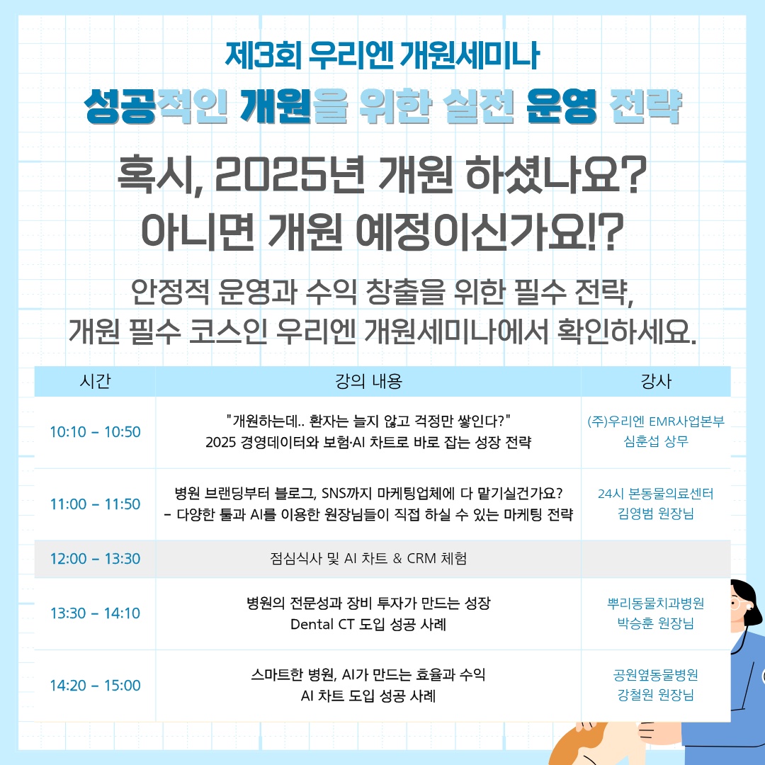 동물병원 전용 이미징 장비 및 전자차트 기업 우리엔이 12월 7일(일) ‘제3회 우리엔 개원세미나’를 개최한다.