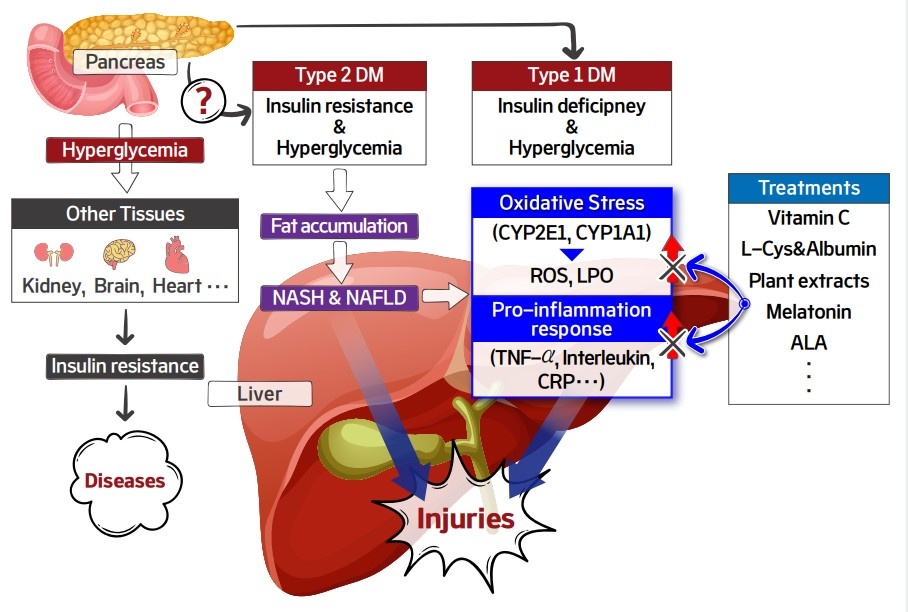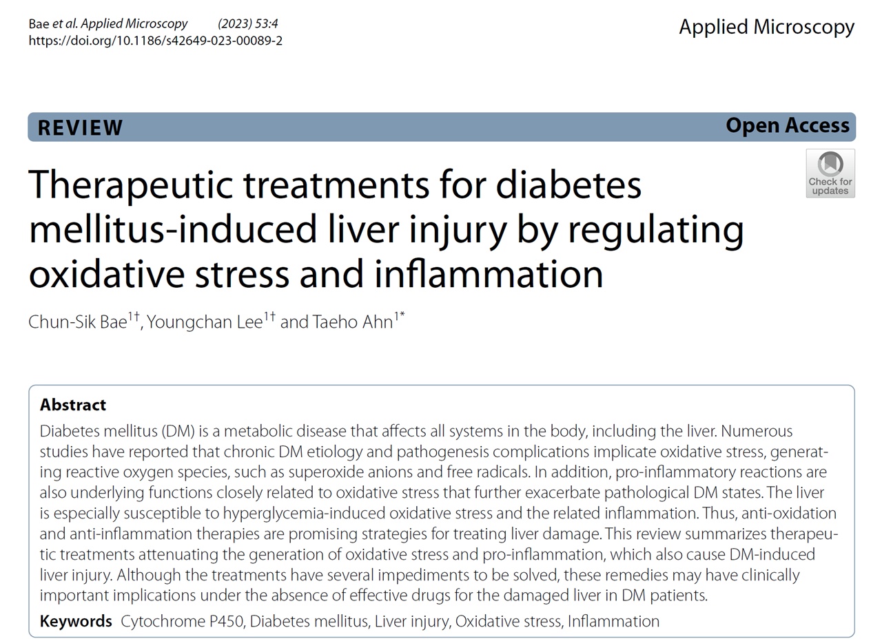이번에 선정된 논문(Therapeutic treatments for diabetes mellitus-induced liver injury by regulating oxidative stress and inflammation)은 2023년에 게재된 논문으로 산화 스트레스와 염증 기전을 조절하여 당뇨로 인한 간 조직 손상을 치료할 수 있는 후보 물질의 효과를 규명한 연구다.