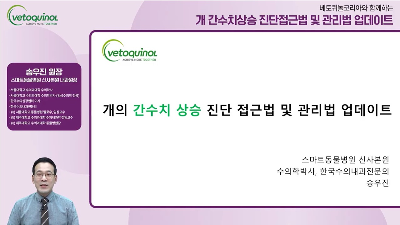 이날 웨비나에서는 송우진 스마트동물병원 신사본원 내과원장이 연자로 나서 간효소 수치 및 간기능 검사부터 간 질환의 다양한 분류와 원인별 치료 및 관리 원칙을 강의했다.
