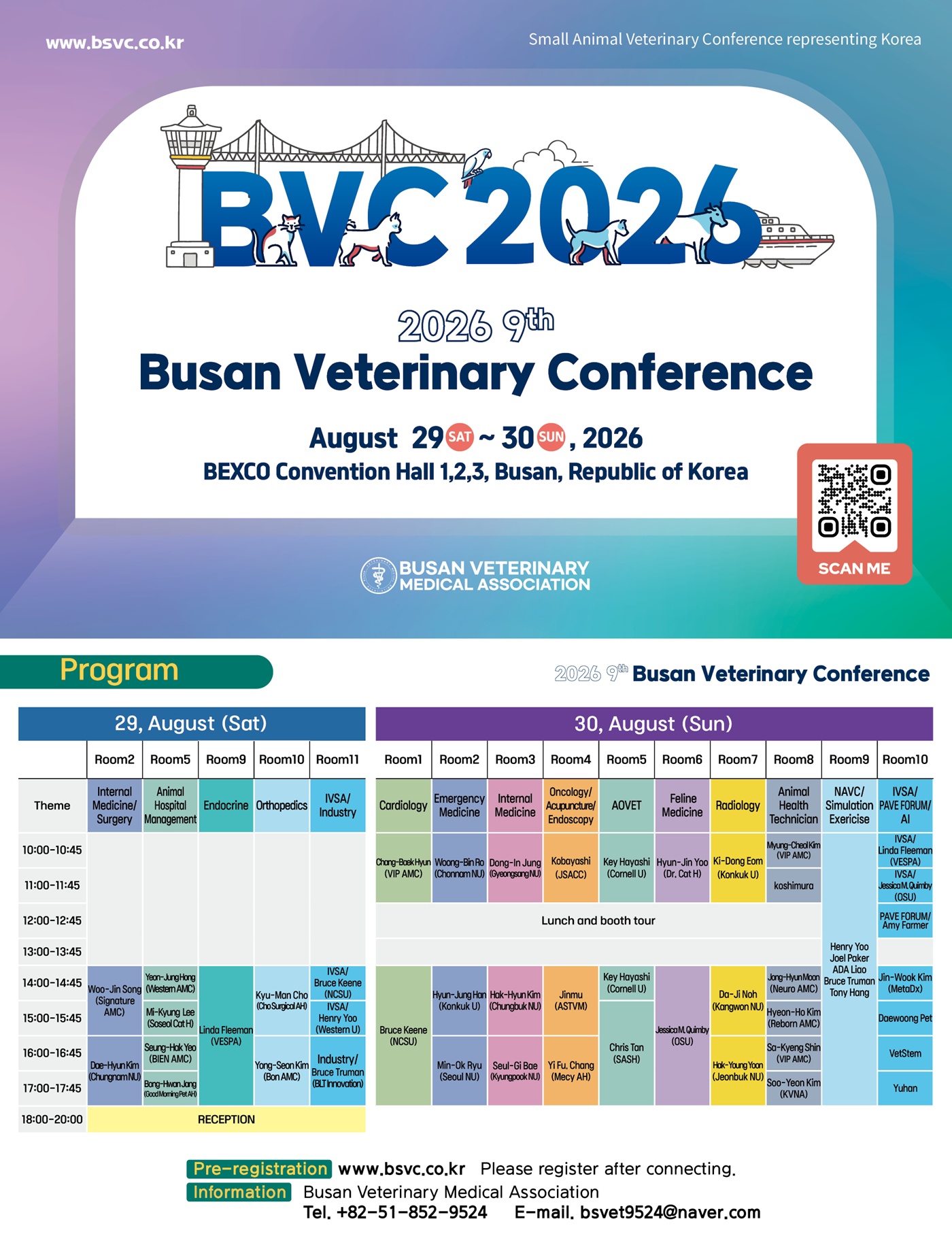 아시아 각국 수의사회 리더들이 모여 국제교류, 원헬스 정책, 산업 발전 전략을 논의하는 아시아수의리더포럼(Asian Veterinary Leadership Forum, AVLF)도 새롭게 선보인다. 국제수의과대학학생협회 한국지부(IVSA 한국지부)가 주최하는 ‘IVSA Summer Event in Busan’도 동시 개최된다.