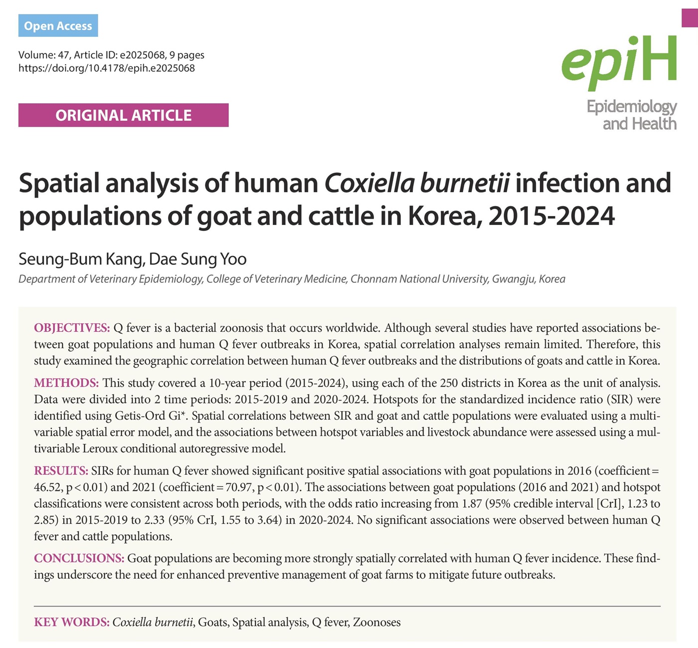 강승범 학생이 제1저자로 참여한 이번 논문(Spatial analysis of human Coxiella burnetii infection and populations of goat and cattle in Korea 2015-2024)은 국내 인간 Q열(큐열) 발생과 염소 및 소의 개체수 간의 공간적 상관관계를 2015년부터 2024년까지의 기간 동안 분석한 최초의 연구다.