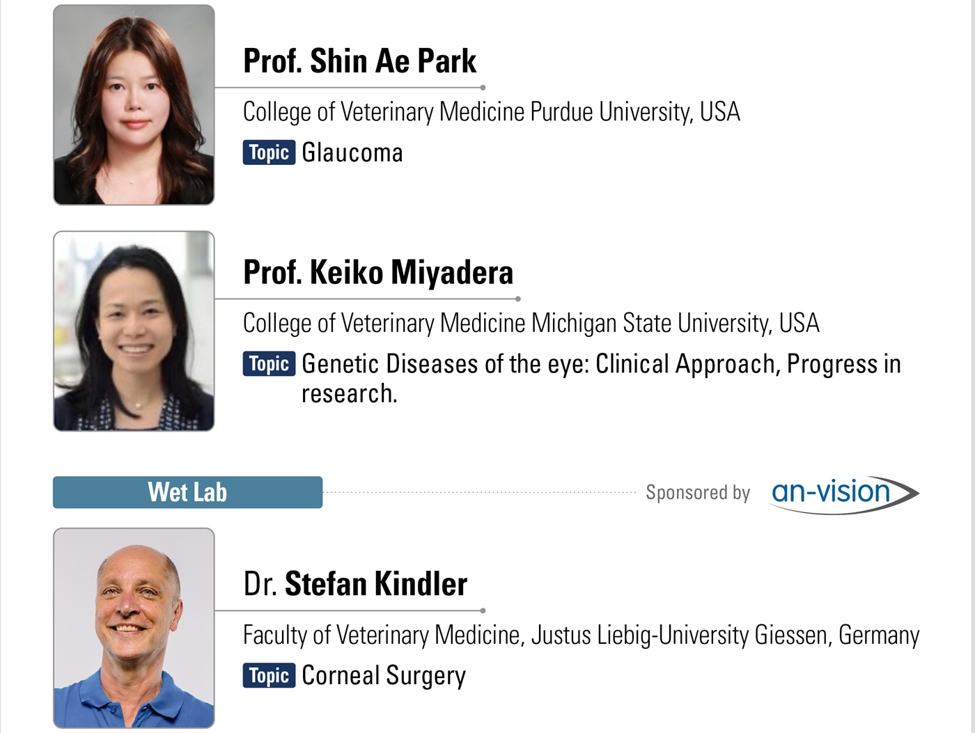 한국 수의사 출신 중 최초로 미국수의안과전문의(DACVO) 자격을 취득한 박신애 미국 퍼듀대학교 수의과대학 교수와 Keiko Miyadera 미시간주립대 교수(미국수의안과전문의)가 연자로 나서 각각 녹내장과 눈의 유전질환을 주제로 강의한다.
