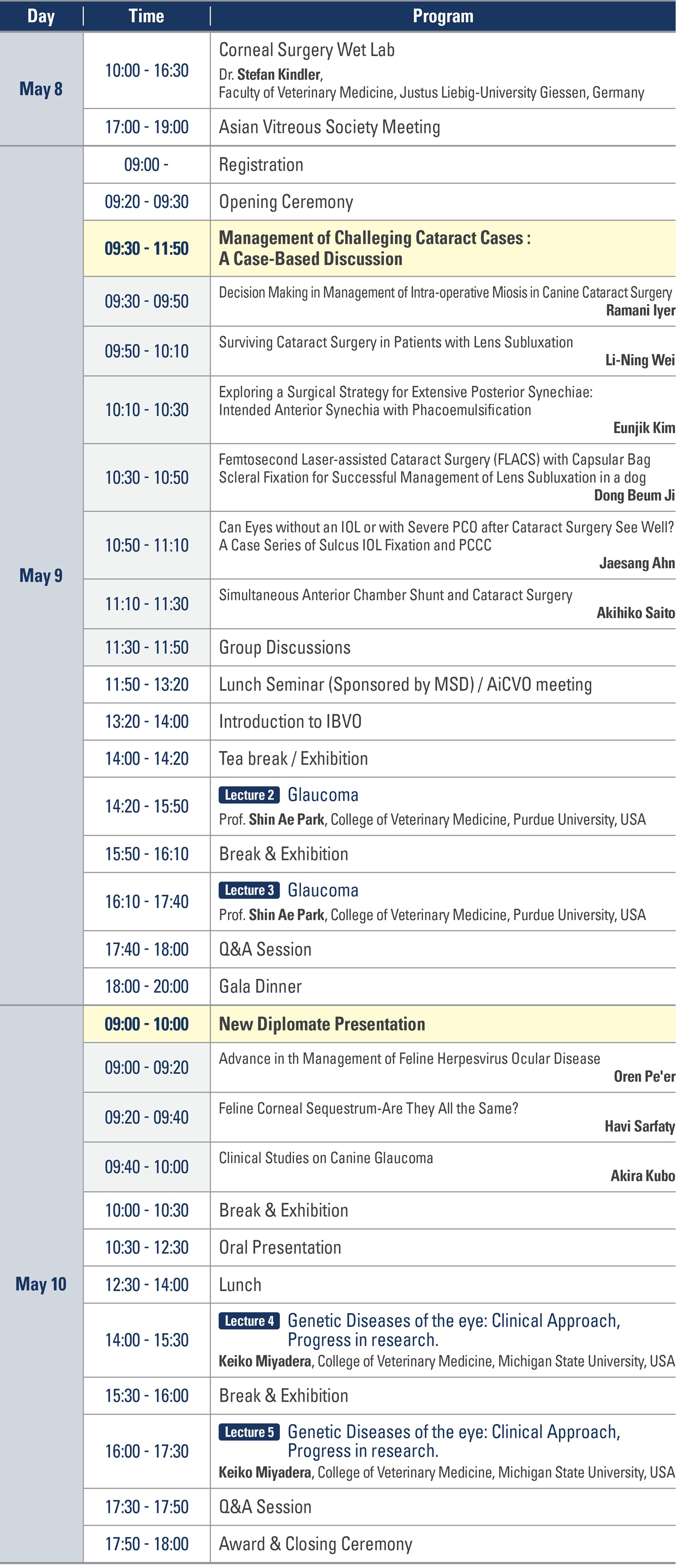 이외에도 어려운 백내장 케이스에 대한 디스커션과 신규 전문의 강의, 구두발표 등이 예정되어 있다. 아시아수의안과전문의 회의도 진행된다.