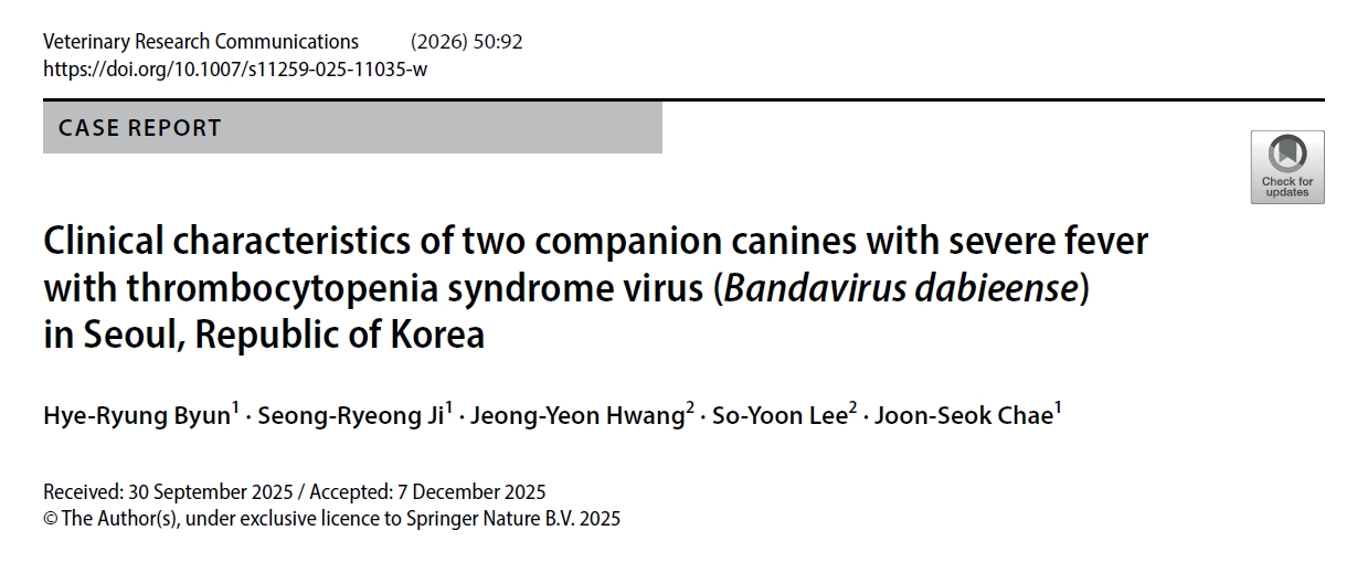 (Byun, HR., Ji, SR., Hwang, JY. et al. Clinical characteristics of two companion canines with severe fever with thrombocytopenia syndrome virus (Bandavirus dabieense) in Seoul, Republic of Korea. Vet Res Commun 50, 92 (2026).)