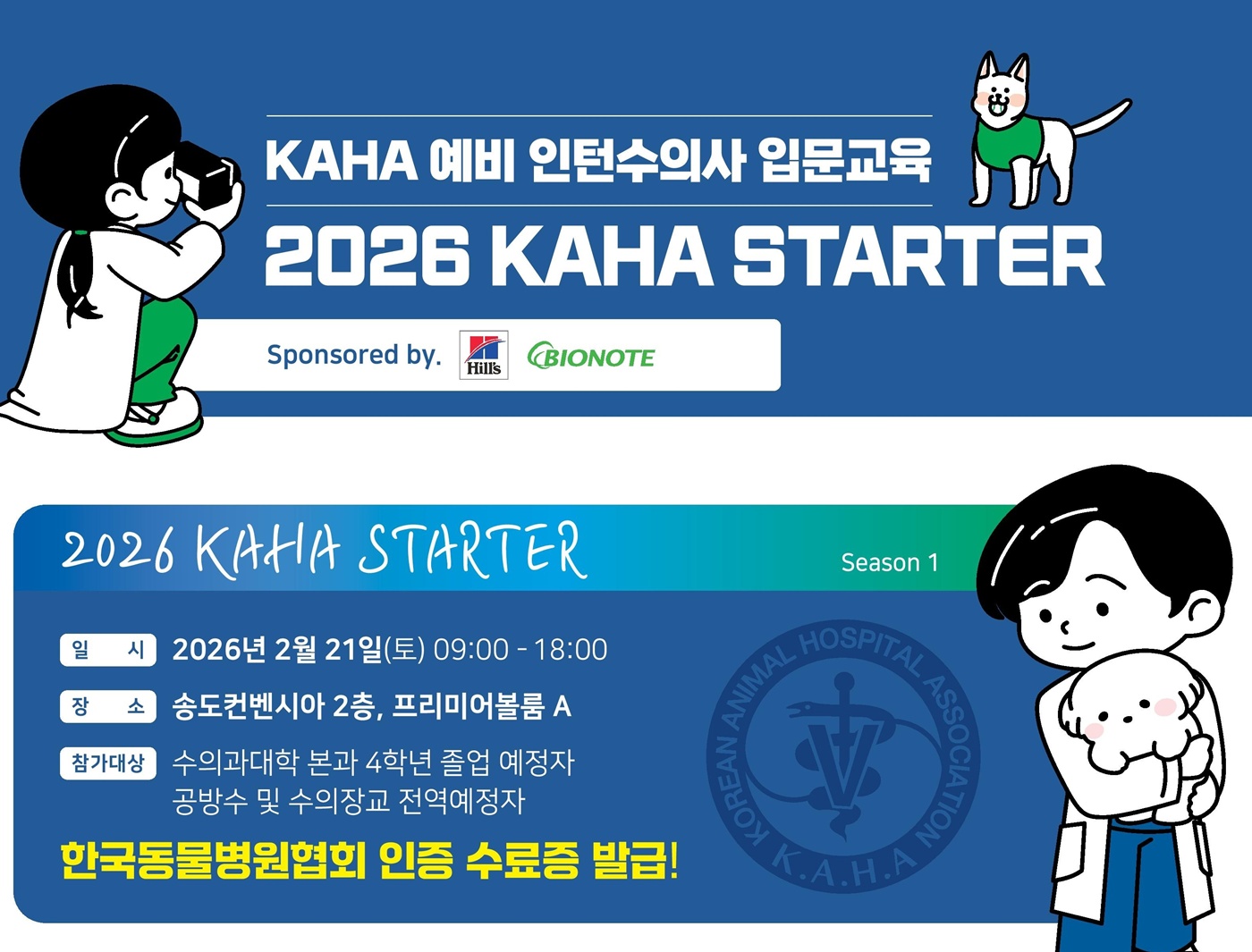 한국동물병원협회(KAHA, 회장 최이돈)가 21일(토) 인천 송도컨벤시아에서 ‘KAHA 예비 인턴수의사 입문교육 – 2026 KAHA STARTER(카하 스타터)’를 개최하는 것이다.