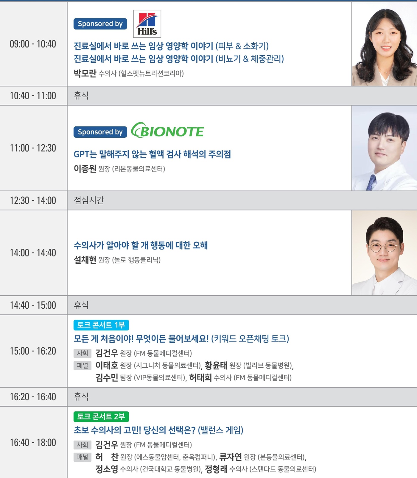 토크 콘서트 1부는 이태호 원장(시그니처 동물의료센터), 황윤태 원장(빌리브동물병원), 김수민 팀장(VIP동물의료센터), 허태희 수의사(FM동물메디컬센터)가 패널로 나서고, 2부는 허찬 원장(에스동물암센터), 류자원 원장(본동물의료센터), 정소영 수의사(건국대학교동물병원), 정형래 수의사(스탠다드동물의료센터)가 패널로 나선다.