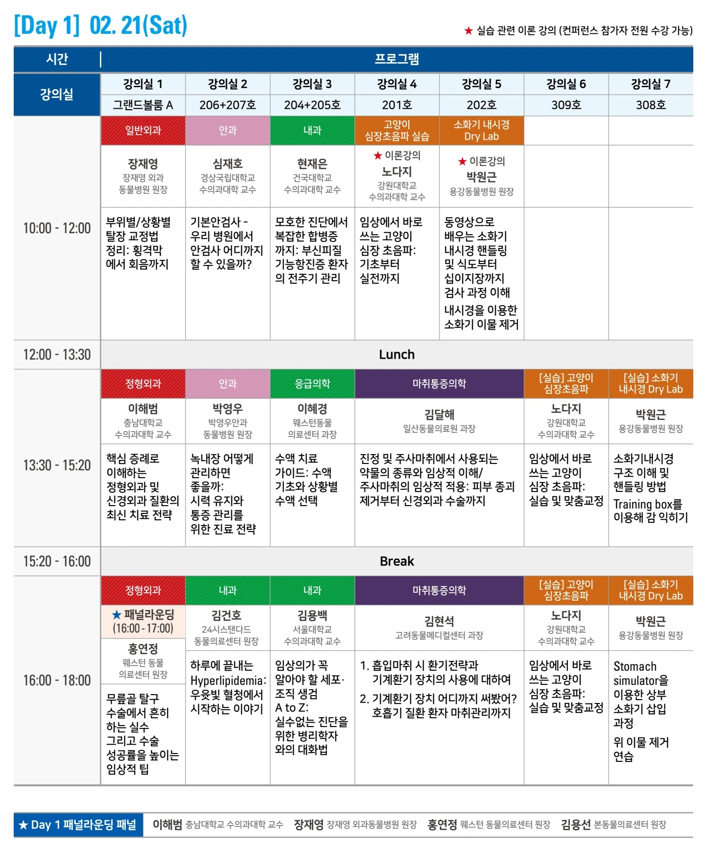 첫째 날에는 충남대 이해범 교수, 장재영외과동물병원 장재영 원장, 웨스턴동물의료센터 홍연정 원장, 본동물의료센터 김용선 원장이 정형외과 패널토론자로 나서고, 둘째 날에는 전북대 윤학영 교수, 시그니처동물의료센터 송우진 원장, VIP동물의료센터 김성수 원장, 더케어동물의료센터 김예원 원장이 패널토론자로 나선다.