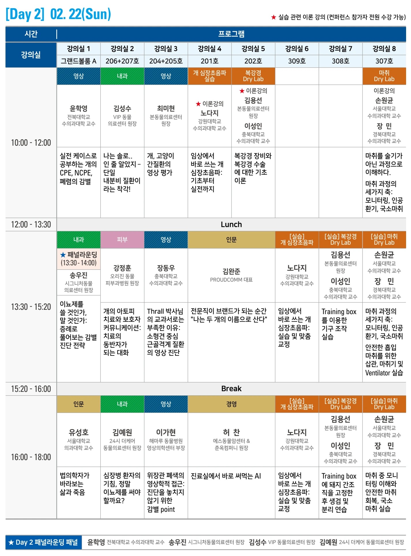 22일(일)에는 총 8개 강의실에서 영상, 내과, 피부 강의와 개 심장초음파 실습 교육, 복강경 Dry Lab 실습, 마취 Dry Lab 실습 교육이 이어진다.