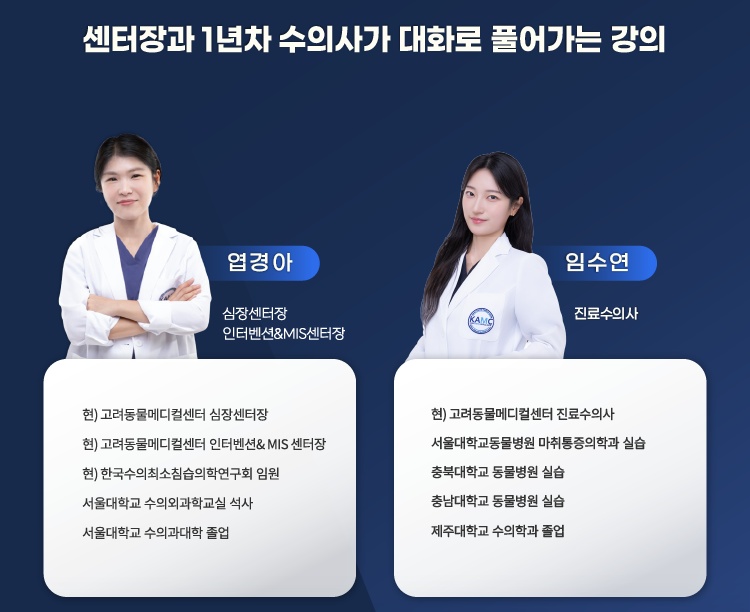연부조직외과를 전공하고 심장센터에서 브이클램프(V-Clamp) 수술로 불리는 TEER(Transcatheter Edge to Edge repair) 수술팀을 이끌고 있는 엽경아 센터장과 임수연 수의사가 함께 구성한 온라인 무료 웨비니다.