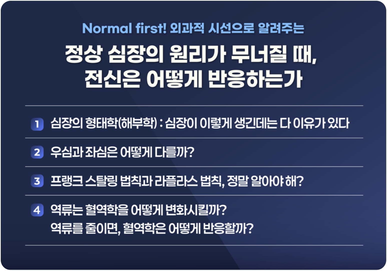 또한, 이러한 경험을 통해 “환자 순환기의 best version을 어떻게 유지해 줄지, 어느 장기를 먼저 치료해야 하는지도 판단할 수 있게 됐다”며 심장의 해부, 생리, 병리를 다루는 강의를 준비하게 된 배경을 설명했다.