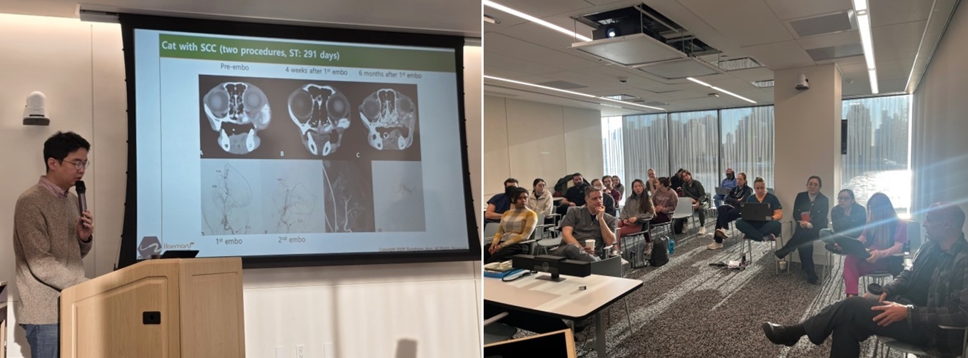 해마루동물병원 인터벤션센터 전성훈 센터장이 지난 1월 20일, 미국 뉴욕에 있는 The Animal Medical Center (현 Schwarzman Animal Medical Center; 이하 AMC)에서 초청강연을 했다. 강연은 AMC 종양센터 소속 종양외과, 종양내과, 방사선종양학과 전문의 및 레지던트를 대상으로 진행됐으며, 구강 및 비뇨기 종양색전술에 관한 최근 연구 성과와 실제 임상 사례를 중심으로 이뤄졌다.